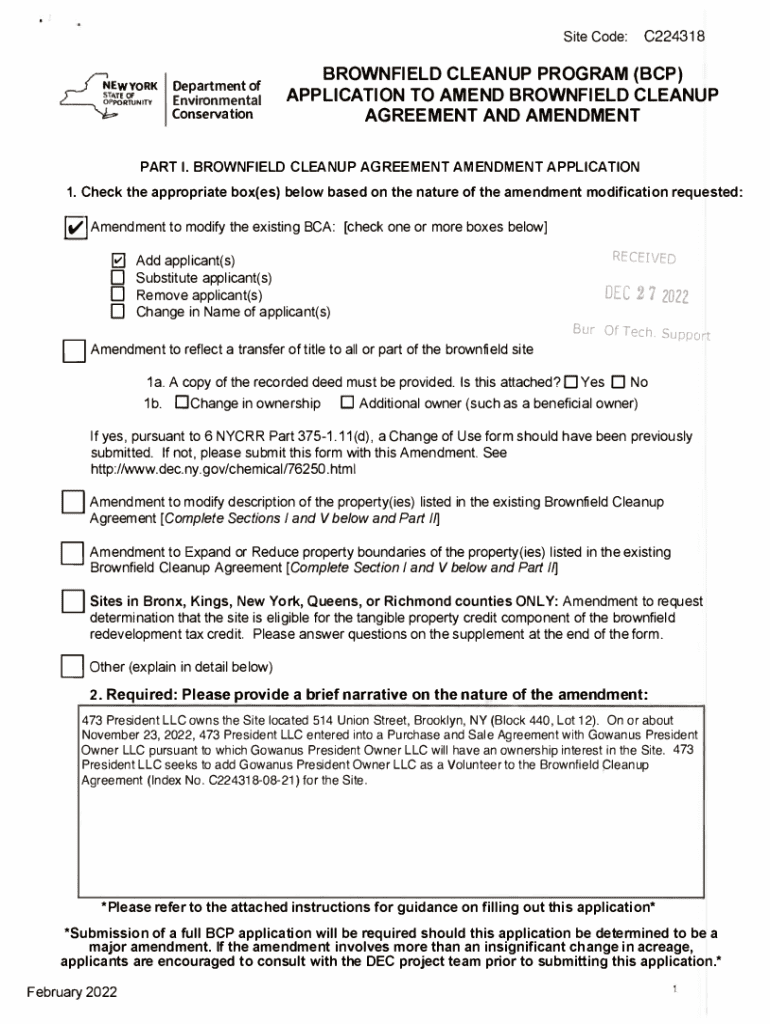 Site Code:wvoRK RN,TYDepartment of Environmental ConservationC224318BROWNFIELD CLEANUP PROGRAM (BCP) APPLICATION TO AMEND BROWNFIELD CLEANUP AGREEMENT AND AMENDMENTPART I. BROWNFIELD CLEANUP AGREEMENT