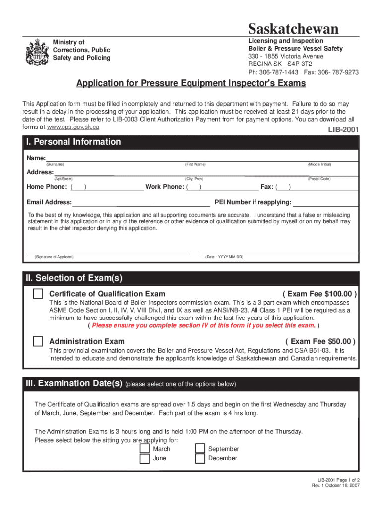 Saskatchewan Licensing and Inspection Boiler & Pressure Vessel Safety 330 1855 Victoria Avenue REGINA SK S4P 3T2 Ph: 3067871443 Fax: 306 7879273Ministry of Corrections, Public Safety and PolicingApplication