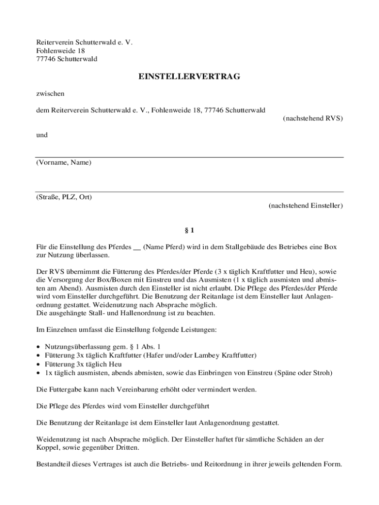 Reiterverein Schutterwald e. V. Fohlenweide 18 77746 SchutterwaldEINSTELLERVERTRAG zwischen dem Reiterverein Schutterwald e. V., Fohlenweide 18, 77746 Schutterwald (nachstehend RVS) und(Vorname, Name)(Strae,