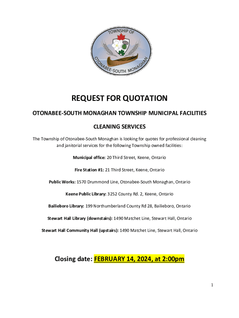 The Township of Otonabee-South Monaghan is seeking quotes for professional cleaning and janitorial services for various municipal facilities including the Municipal Office, Fire Station #1, Public Works, and libraries. The contract may be awarded to the bidder providing the best value based on submitted quotations. A scheduled visitation to the facilities is recommended before proposal submission, and all work is to be completed in accordance with the specified requirements. Quotes must be...