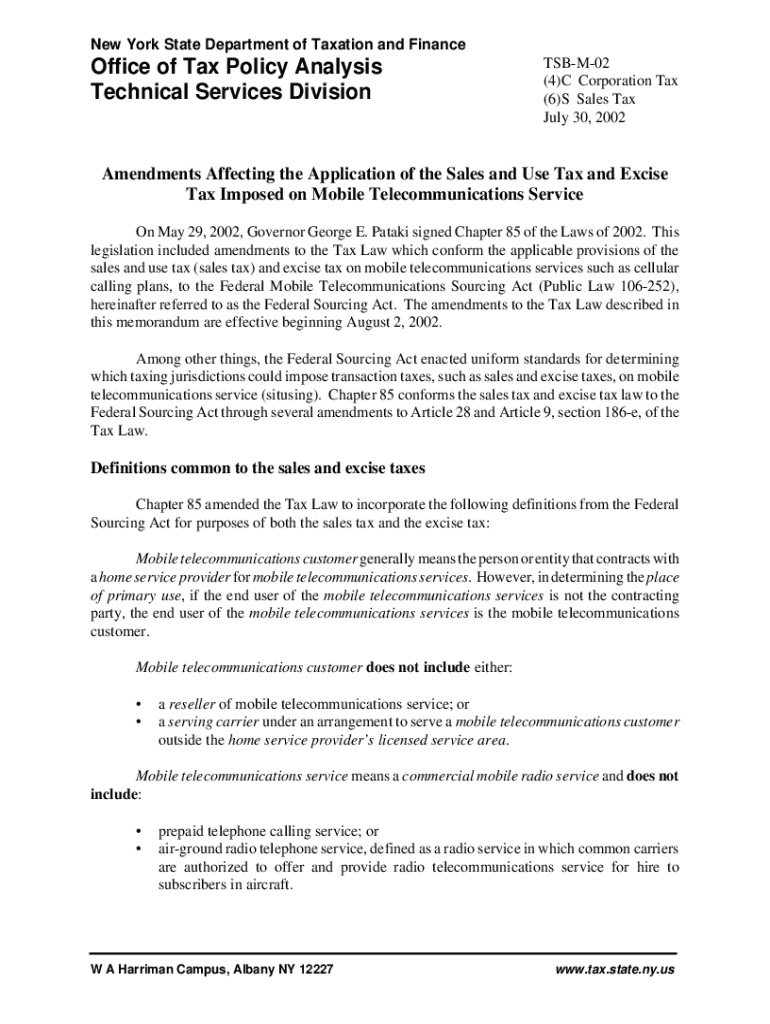 New York State Department of Taxation and FinanceOffice of Tax Policy Analysis Technical Services DivisionTSBM02 (4)C Corporation Tax (6)S Sales Tax July 30, 2002Amendments Affecting the Application