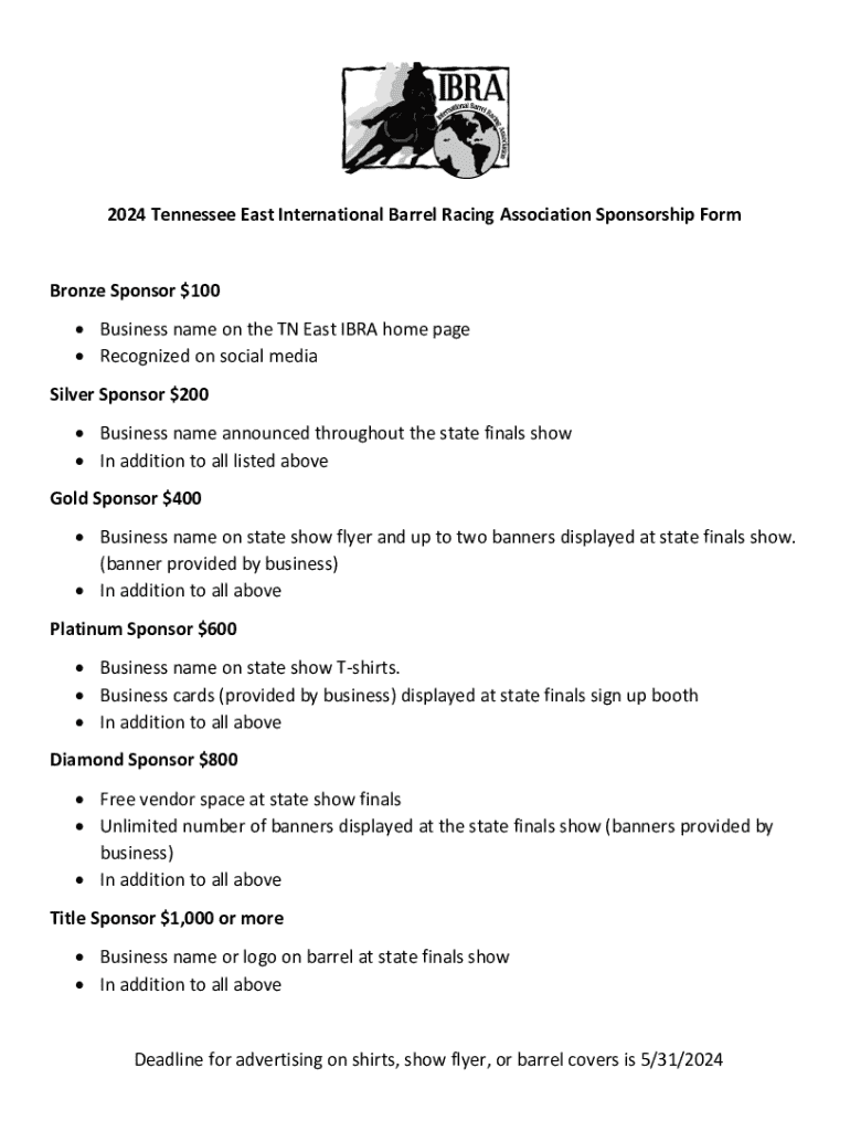 2024 Tennessee East International Barrel Racing Association Sponsorship FormBronze Sponsor $100 Business name on the TN East IBRA home page Recognized on social media Silver Sponsor $200 Business