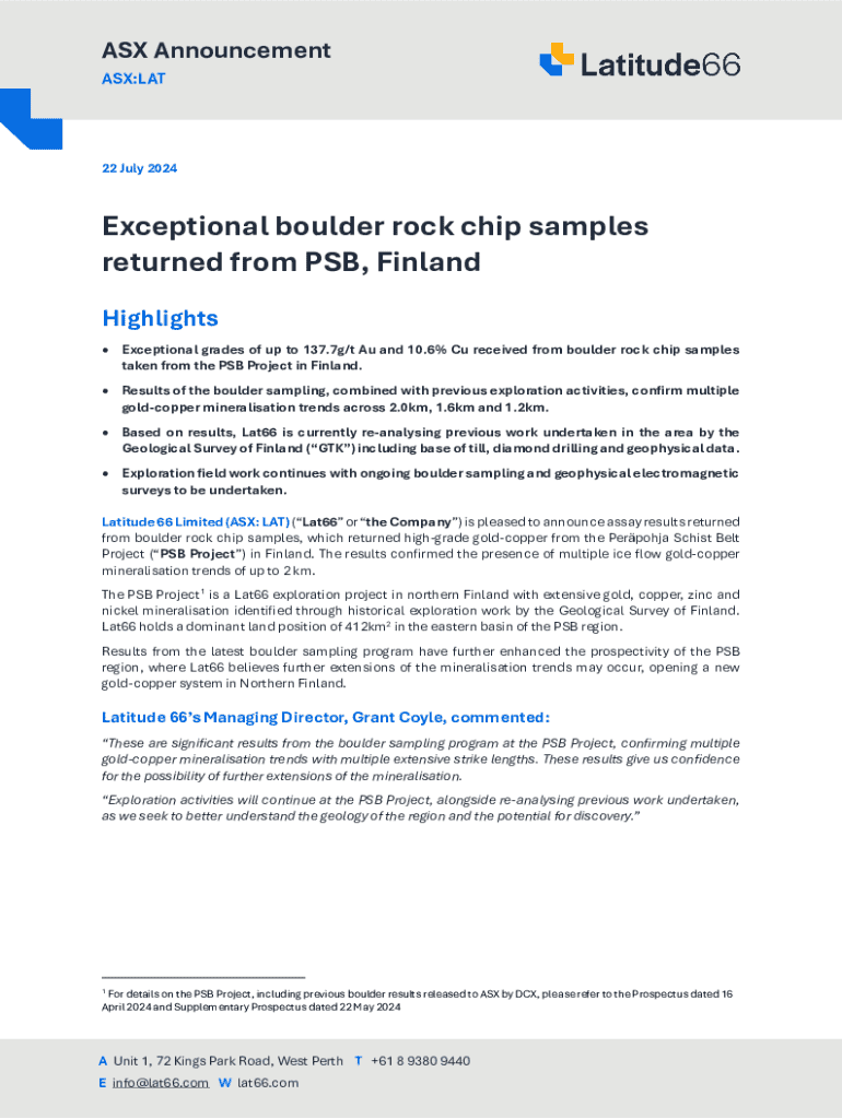 ASX Announcement ASX:LAT22 July 2024Exceptional boulder rock chip samples returned from PSB, Finland Highlights Exceptional grades of up to 137.7g/t Au and 10.6% Cu received from boulder rock chip