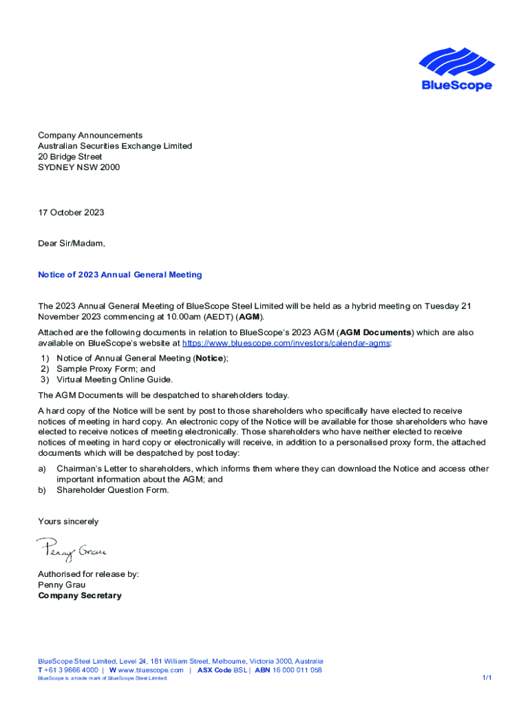 Company Announcements Australian Securities Exchange Limited 20 Bridge Street SYDNEY NSW 200017 October 2023 Dear Sir/Madam, Notice of 2023 Annual General Meeting The 2023 Annual General Meeting of