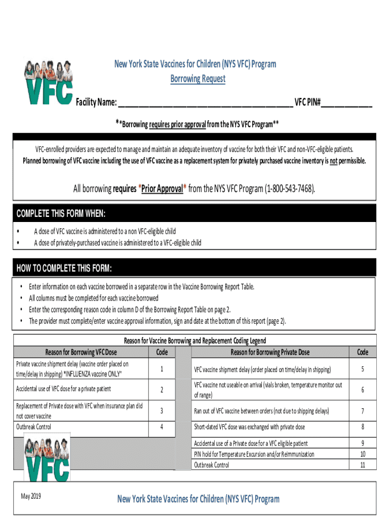 New York State Vaccines for Children (NYS VFC) Program Borrowing Request Facility Name: ___ VFC PIN#___ **Borrowing requires prior approval from the NYS VFC Program** VFCenrolled providers are expected