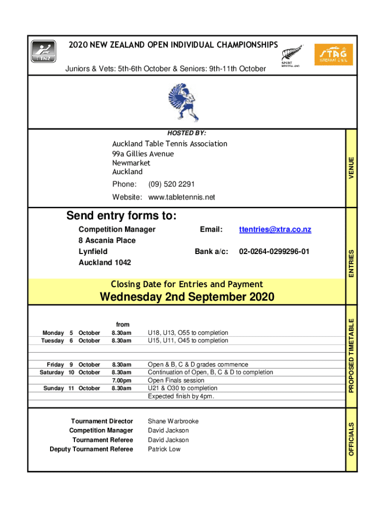 The 2020 New Zealand Open Individual Championships will take place from October 5th to October 11th, with events for juniors, veterans, and seniors hosted by the Auckland Table Tennis Association. Various age categories and grades will compete over the weekends with a detailed timetable provided for each division.