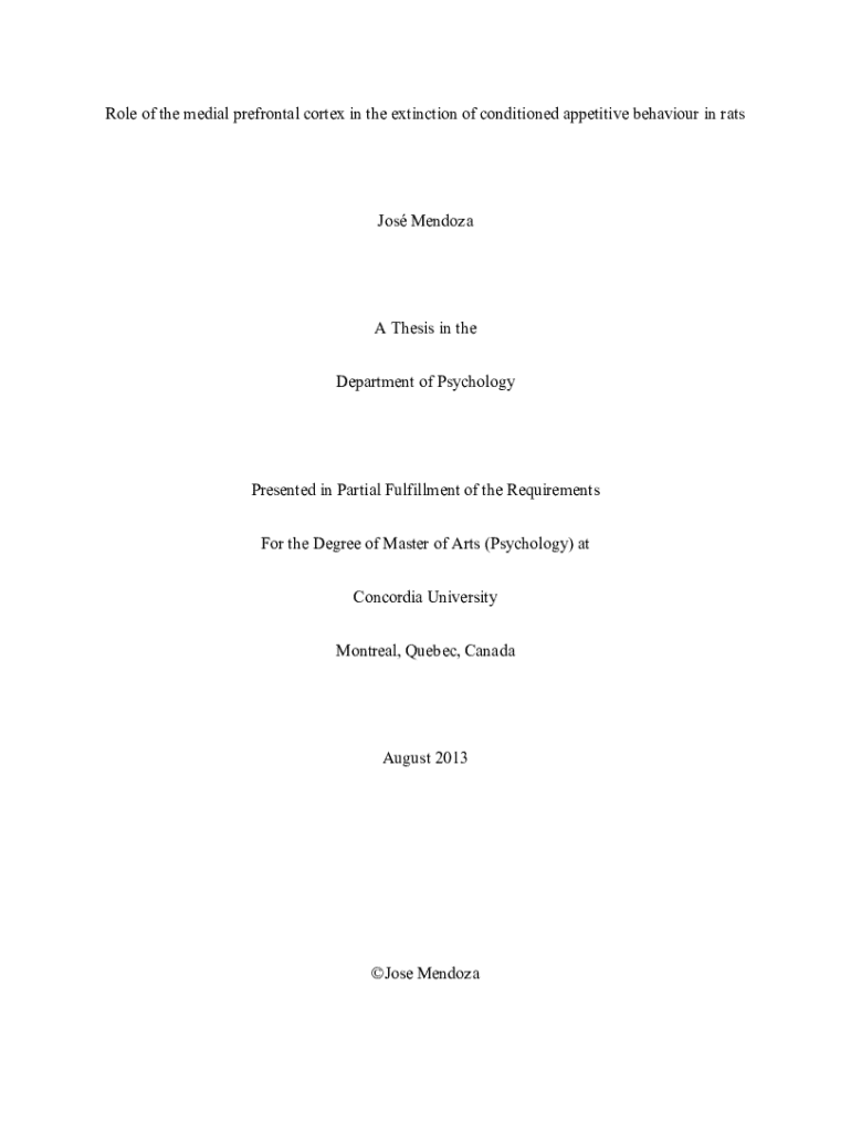 Role of the medial prefrontal cortex in the extinction of conditioned appetitive behaviour in ratsJos MendozaA Thesis in the Department of PsychologyPresented in Partial Fulfillment of the Requirements