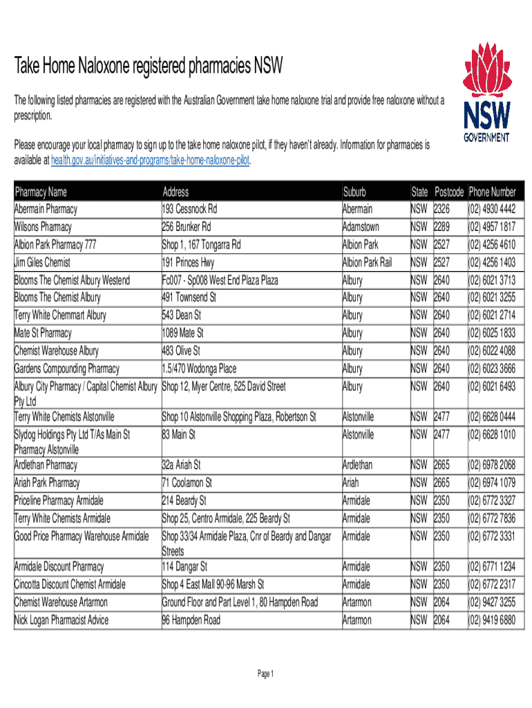 Take Home Naloxone registered pharmacies NSW The following listed pharmacies are registered with the Australian Government take home naloxone trial and provide free naloxone without a prescription.