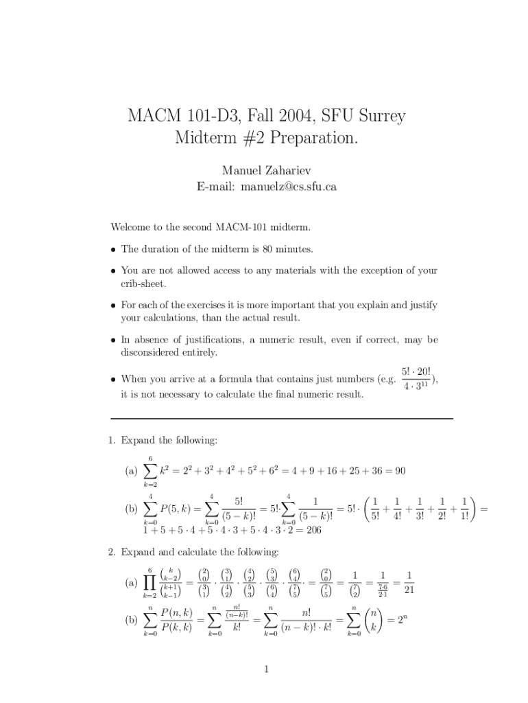 This document provides preparation materials for the second midterm exam in MACM 101 at SFU Surrey. It includes various mathematical exercises, proofs, and problems related to combinatorics and set theory, along with detailed solutions and explanations.