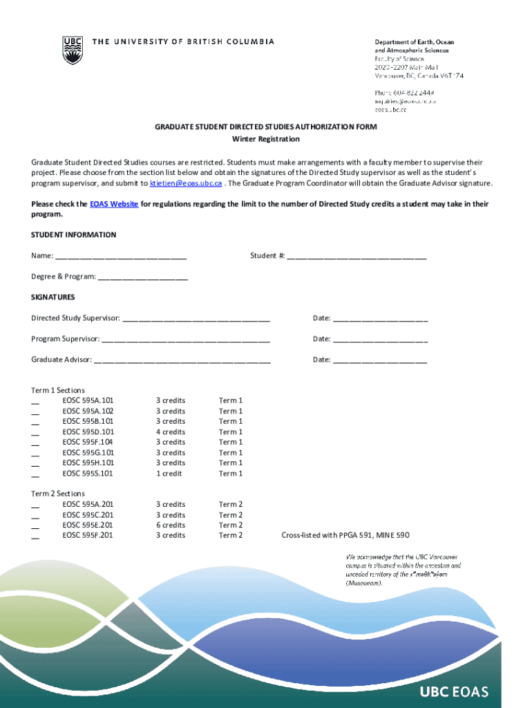 GRADUATE STUDENT DIRECTED STUDIES AUTHORIZATION FORM Winter Registration Graduate Student Directed Studies courses are restricted. Students must make arrangements with a faculty member to supervise