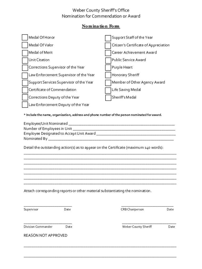 This form is used to nominate individuals or units within the Weber County Sheriff\'s Office for various commendations and awards, recognizing outstanding actions and service.