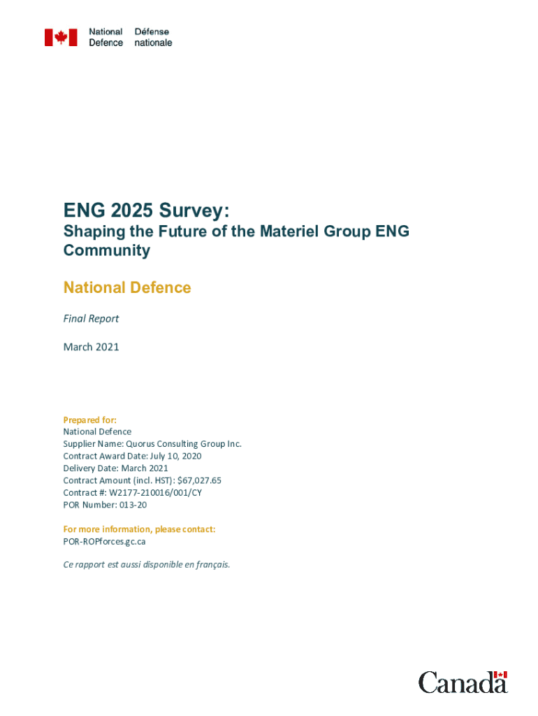 ENG 2025 Survey:Shaping the Future of the Materiel Group ENG Community National Defence Final Report March 2021Prepared for: National Defence Supplier Name: Quorus Consulting Group Inc. Contract Award
