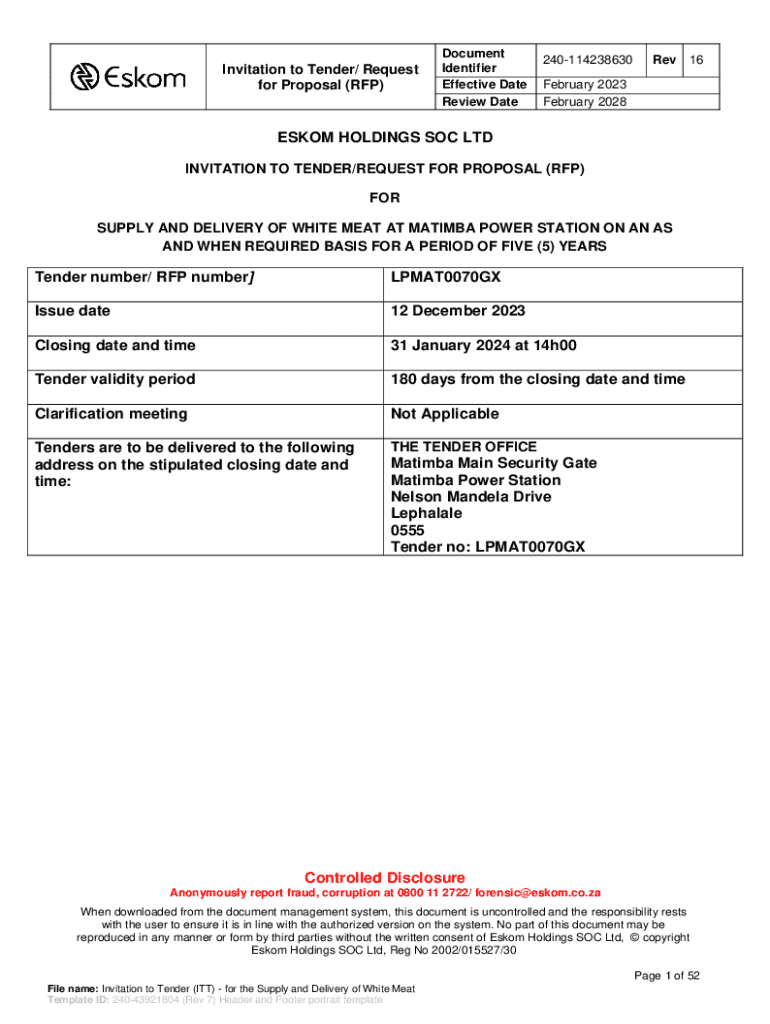 This document serves as an official invitation from Eskom Holdings SOC Ltd for the supply and delivery of white meat to Matimba Power Station on an as and when required basis for a period of five years. It outlines the tender identifier, effective date, closing date, and details regarding eligibility, submission requirements, and evaluation criteria.