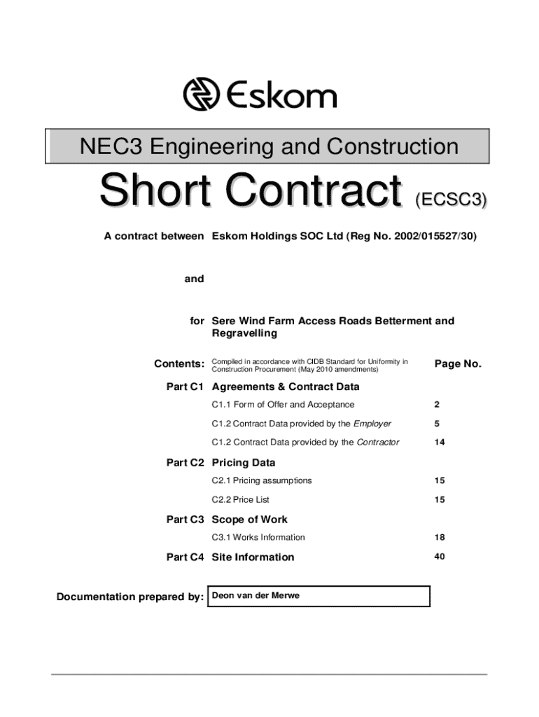 This document outlines the contract between Eskom Holdings SOC Ltd and the contractor for the rehabilitation, betterment, and regravelling of access roads at the Sere Wind Farm. It includes details of the scope of work, pricing data, agreements, contract conditions, and site information, ensuring compliance with health, safety, and environmental regulations.