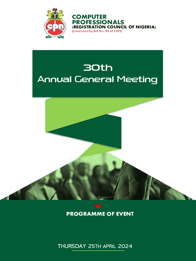COMPUTER PROFESSIONALS(REGISTRATION COUNCIL OF NIGERIA) (Established by Act No. 49 of 1993)30th Annual General MeetingPROGRAMME OF EVENTTHURSDAY 25TH APRIL 202430thAnnualGeneral MeetingNATIONAL ANTHEM