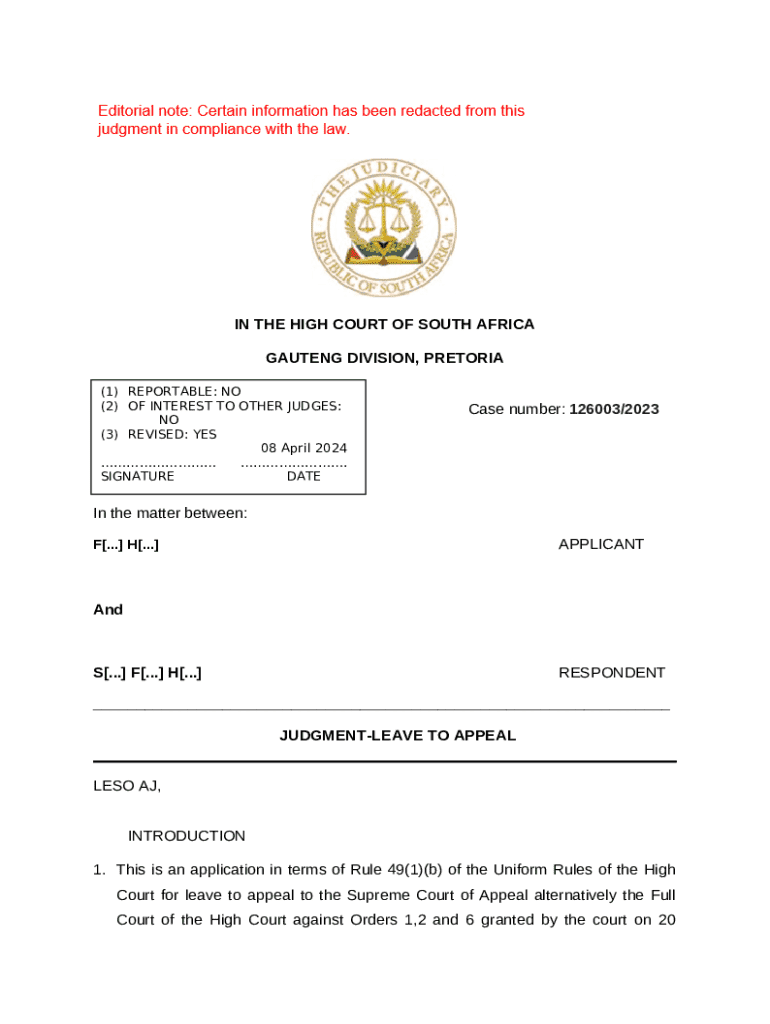 IN THE HIGH COURT OF SOUTH AFRICA GAUTENG DIVISION, PRETORIA (1) REPORTABLE: NO (2) OF INTEREST TO OTHER JUDGES: NO (3) REVISED: YES /2023 08 April 2024 . SIGNATURE DATECase number: 126003/2023In