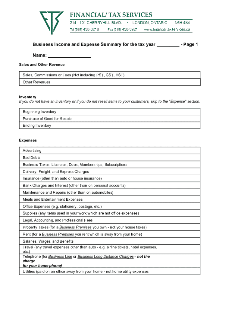 A comprehensive summary document for businesses to report their income and expenses during a specific tax year, including details on sales revenue, inventory, various types of expenses, auto expenses, and home office costs.
