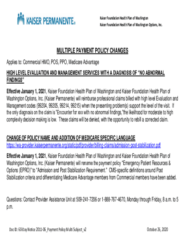 Get the free Kaiser Foundation Health Plan of Washington Multiple Payment Policy Changes