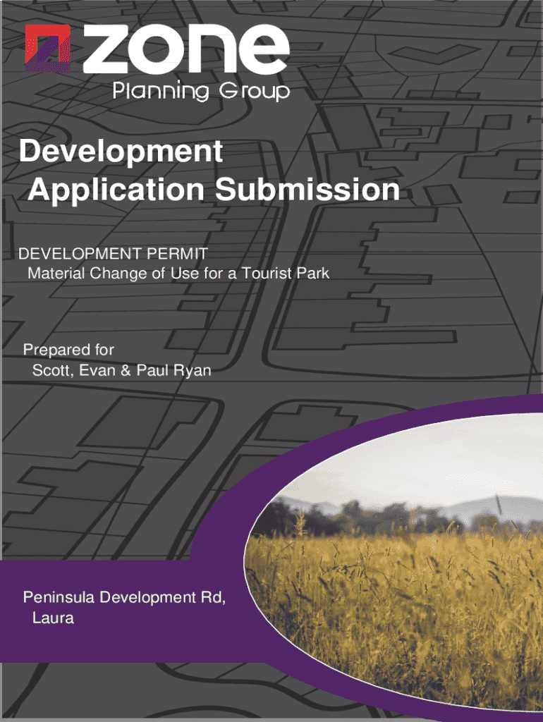 This document outlines a development application for a Development Permit for a Material Change of Use to establish a Tourist Park at Lot 52 Peninsula Development Road, Laura. The proposal includes six relocatable cabins for short-term accommodation, supporting infrastructure, and adherence to relevant statutory planning frameworks and environmental regulations.