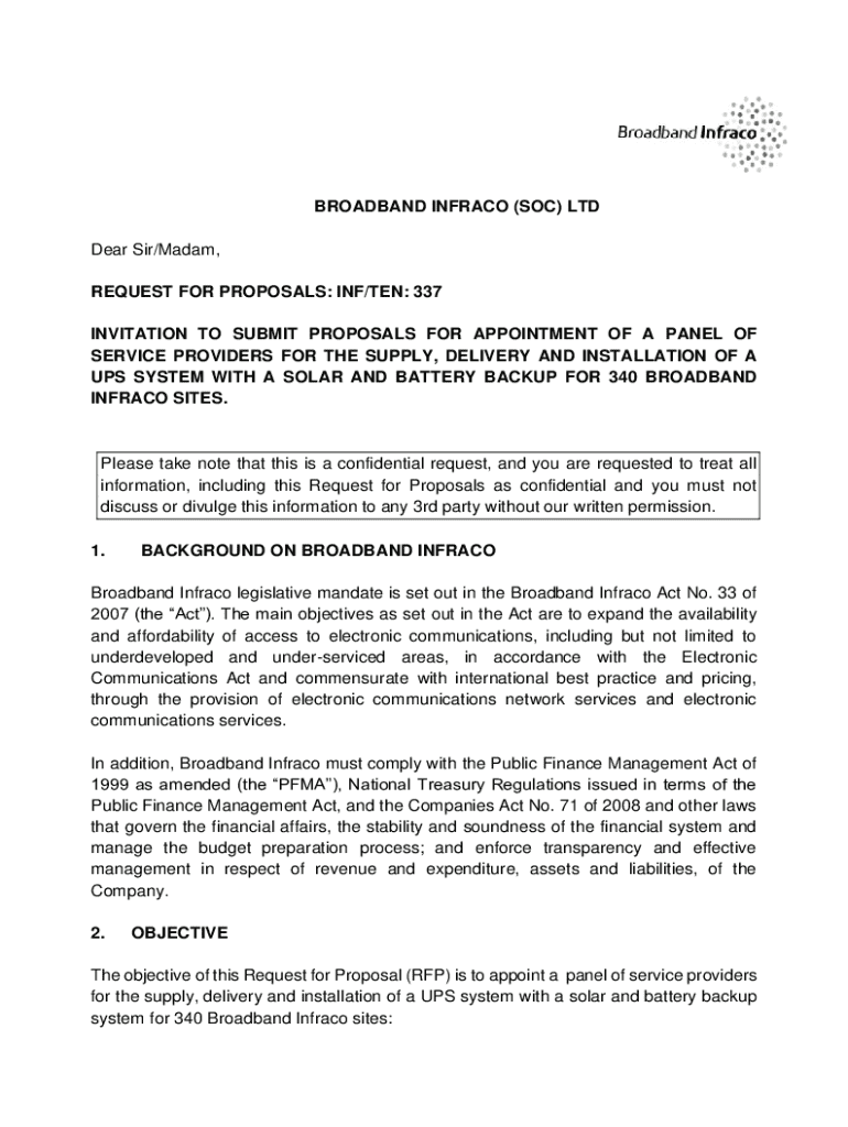 BROADBAND INFRACO (SOC) LTD Dear Sir/Madam, REQUEST FOR PROPOSALS: INF/TEN: 337 INVITATION TO SUBMIT PROPOSALS FOR APPOINTMENT OF A PANEL OF SERVICE PROVIDERS FOR THE SUPPLY, DELIVERY AND INSTALLATION