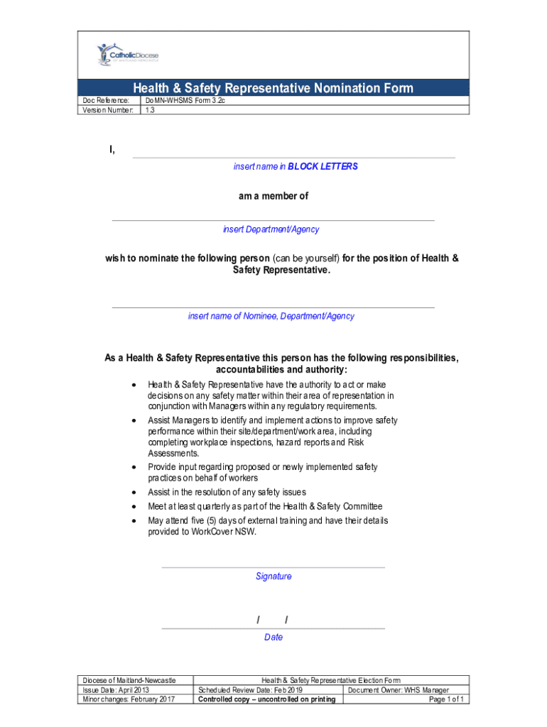 Health & Safety Representative Nomination Form Doc Reference: Version Number:DoMNWHSMS Form 3.2c 1.3I, insert name in BLOCK LETTERSam a member of insert Department/Agencywish to nominate the following