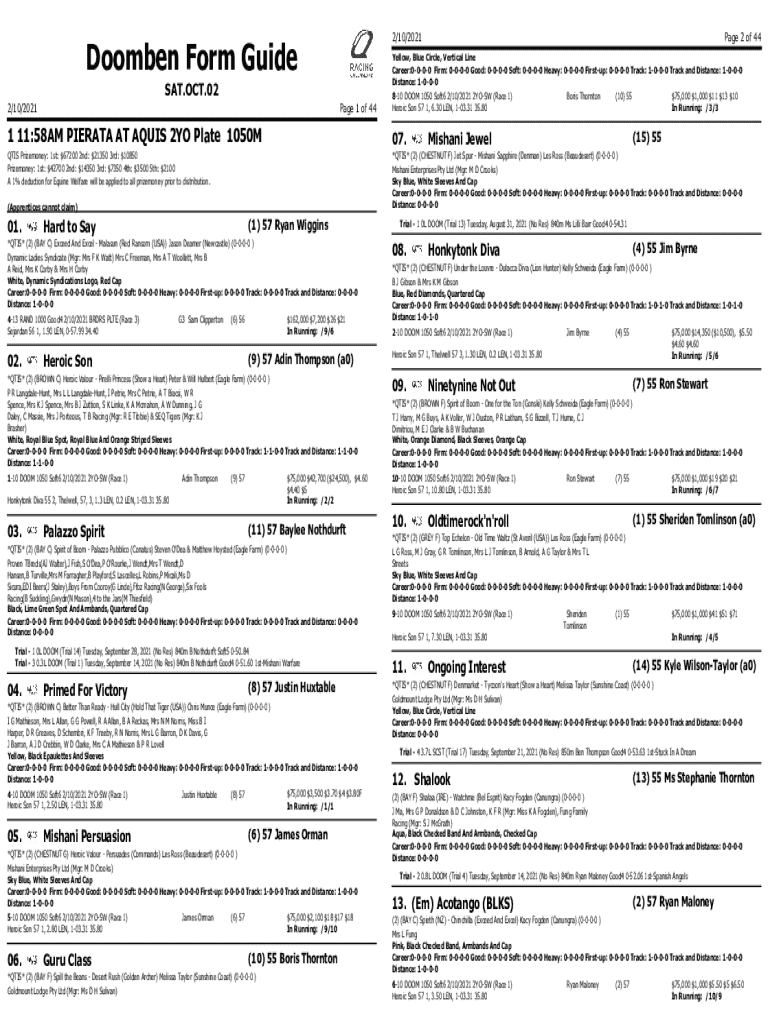 2/10/2021Doomben Form Guide SAT.OCT.02 2/10/2021Page 1 of 441 11:58AM PIERATA AT AQUIS 2YO Plate 1050M(1) 57 Ryan WigginsHard to Say*QTIS* (2) (BAY C) Exceed And Excel Malasun (Red Ransom (USA)) Jason
