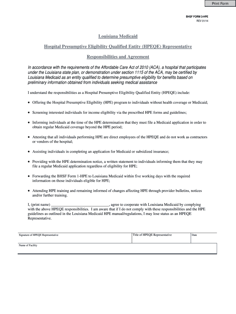 Print Form BHF FORM 3-HPE REV 01/14 Louisiana Medicaid Hospital Presumptive Eligibility Qualified Entity (HERE) Representative Responsibilities and Agreement In accordance with the requirements of