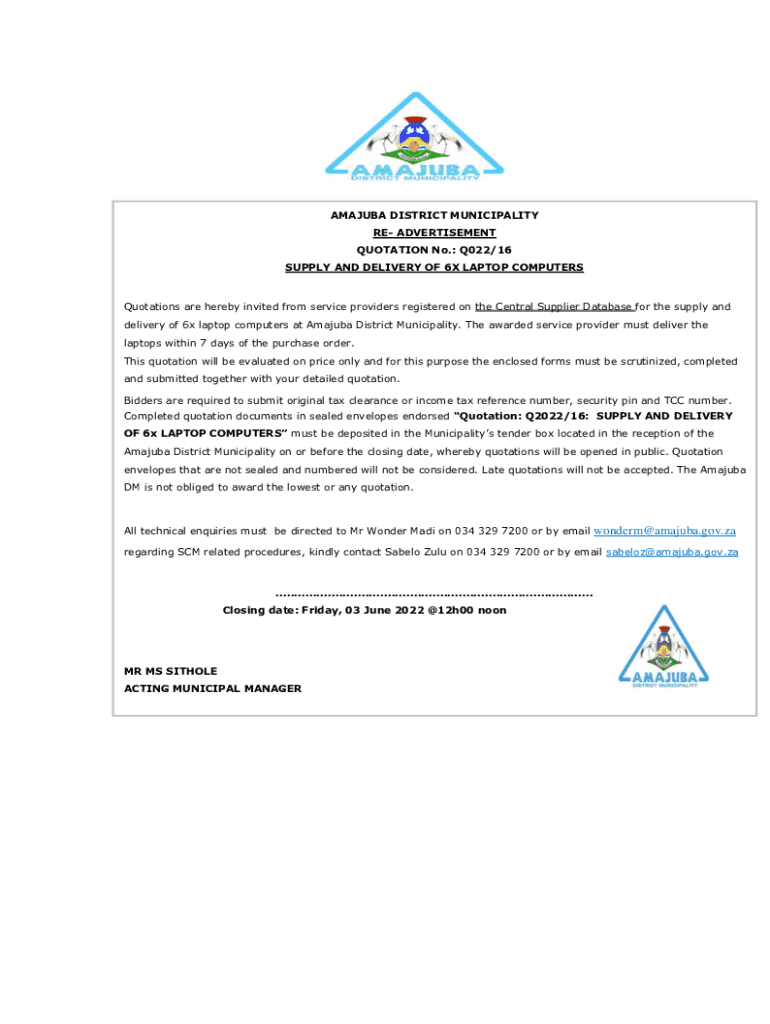 This document is a formal invitation from Amajuba District Municipality for quotations from registered service providers to supply and deliver six laptop computers. The document outlines the specifications for the laptops, submission requirements, evaluation criteria based on pricing, and the necessary documentation for bidders. The closing date for submissions is June 3, 2022.