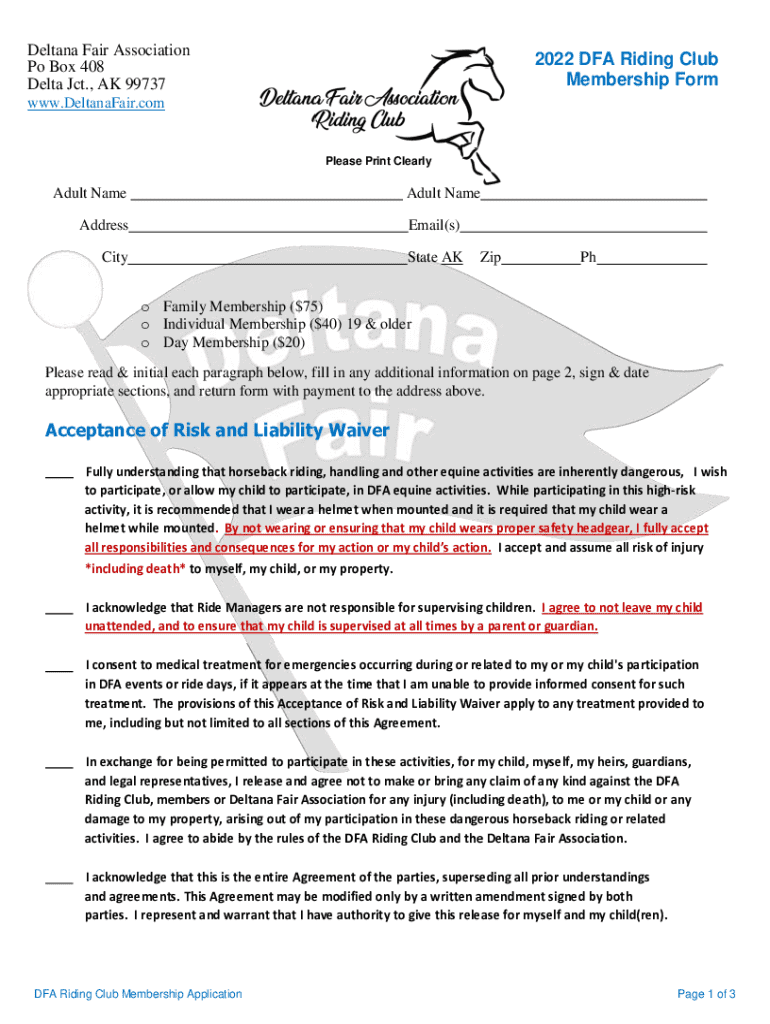 This document is the membership application form for the Deltana Fair Association\'s Riding Club, which includes acceptance of risk and liability waiver, emergency contact information, and consent for photo/modeling release. Membership options are provided along with terms of participation and privacy notice.