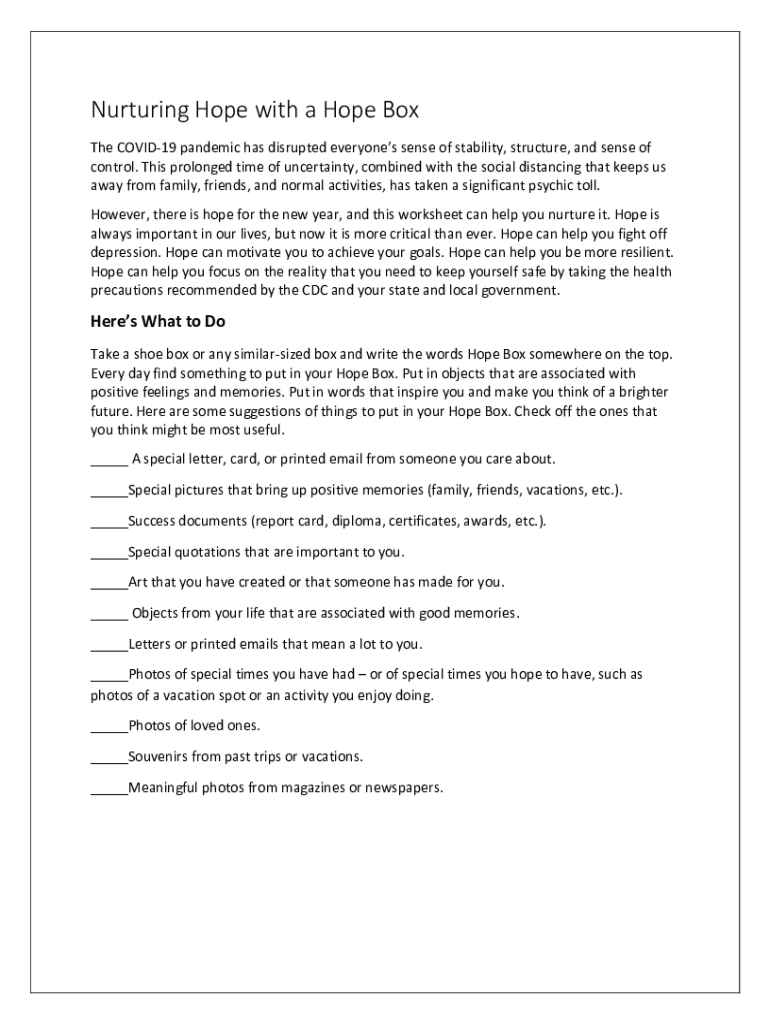 This document provides a worksheet designed to help individuals cultivate hope during the challenges brought on by the COVID-19 pandemic. It outlines the concept of a \'Hope Box\' where users can collect positive reminders, successes, and inspirational messages as a tool for mental well-being and resilience. Additionally, it includes exercises to identify problems, create solutions, and reflect on the effectiveness of hope cultivation.