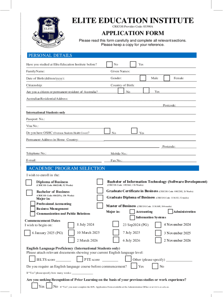 ELITE EDUCATION INSTITUTE CRICOS Provider Code: 03390AAPPLICATION FORM Please read this form carefully and complete all relevant sections. Please keep a copy for your reference.PERSONAL DETAILS Have