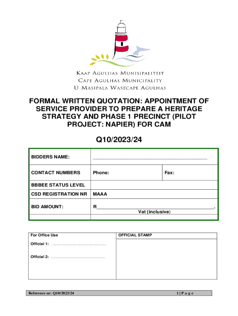 This document details the requirements and conditions for submitting a tender to appoint a service provider responsible for preparing a Heritage Strategy and identifying Phase 1 Precinct (Pilot Project: Napier) for the Cape Agulhas Municipality. It outlines the submission process, evaluation criteria, required documentation, and project deliverables.