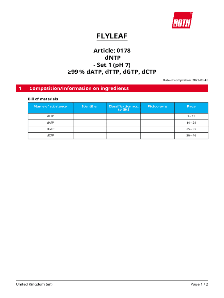 FLYLEAF Article: 0178 dNTP Set 1 (pH 7) 99 % dATP, dTTP, dGTP, dCTP Date of compilation: 202203161Composition/information on ingredients Bill of materials Name of substanceIdentifierClassification