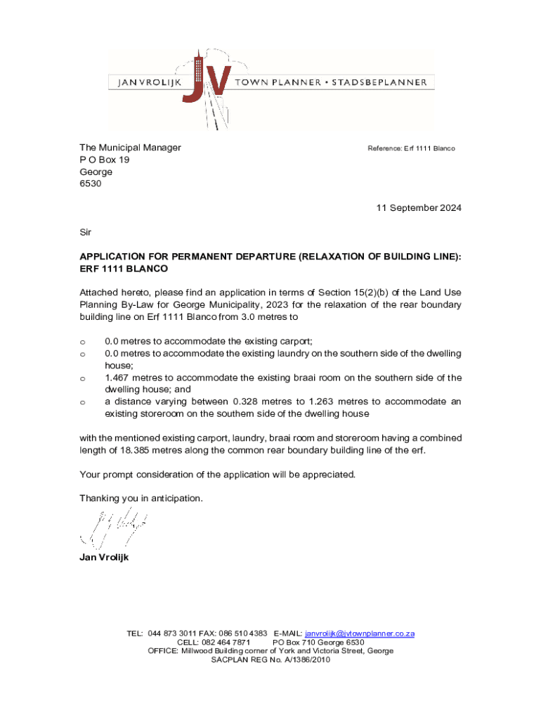 This document pertains to an application submitted to the George Municipality for the relaxation of the rear boundary building line on Erf 1111 Blanco, allowing for the accommodation of existing structures including a carport, laundry, braai room, and storeroom. The application seeks to transform unauthorized improvements into legally recognized structures under the 2023 Land Use Planning By-Law.