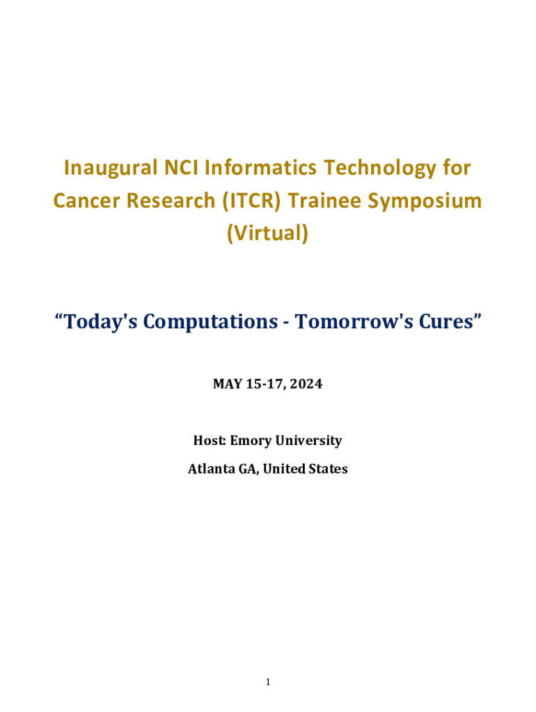 This document provides an overview of the Inaugural NCI Informatics Technology for Cancer Research (ITCR) Trainee Symposium, a virtual event held from May 15-17, 2024, hosted by Emory University. The symposium features keynote lectures, flash talks, and various presentations focused on advancements in cancer research informatics, particularly in the areas of omics technologies, computational tools, and data-driven approaches in oncology. Presentations cover topics ranging from disease...