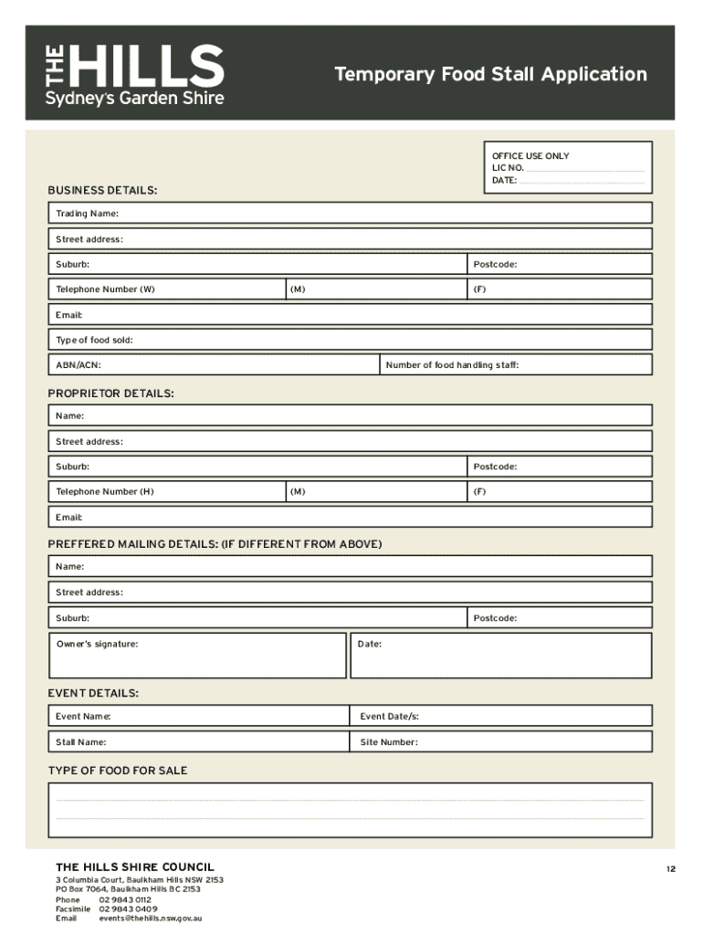 Temporary Food stall ApplicationOFFICE USE ONLY LIC NO. DATE:BUSINESS DETAILS: Trading Name: Street address: Suburb: Telephone Number (W)Postcode: (M)(F)Email: Type of food sold: ABN/ACN:Number of