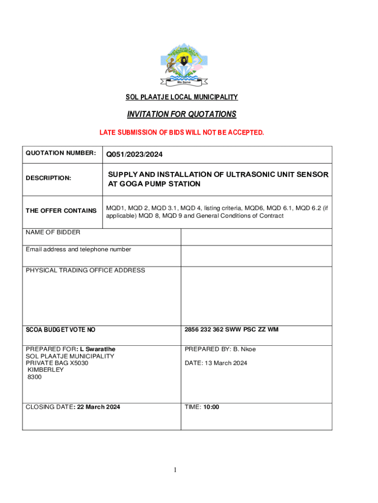 SOL PLAATJE LOCAL MUNICIPALITYINVITATION FOR QUOTATIONS LATE SUBMISSION OF BIDS WILL NOT BE ACCEPTED. QUOTATION NUMBER:Q051/2023/2024DESCRIPTION:SUPPLY AND INSTALLATION OF ULTRASONIC UNIT SENSOR AT