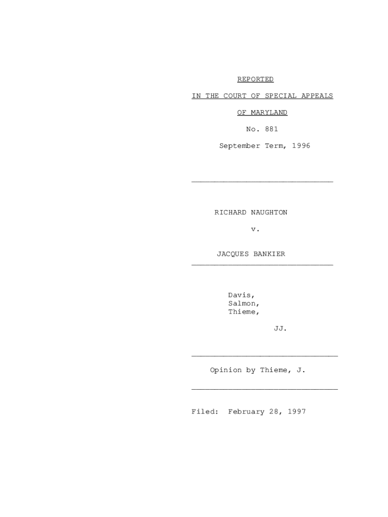 REPORTED IN THE COURT OF SPECIAL APPEALS OF MARYLAND No. 881 September Term, 1996___RICHARD NAUGHTON v. JACQUES BANKIER ___Davis, Salmon, Thieme, JJ. ___ Opinion by Thieme, J. ___ Filed:February 28,