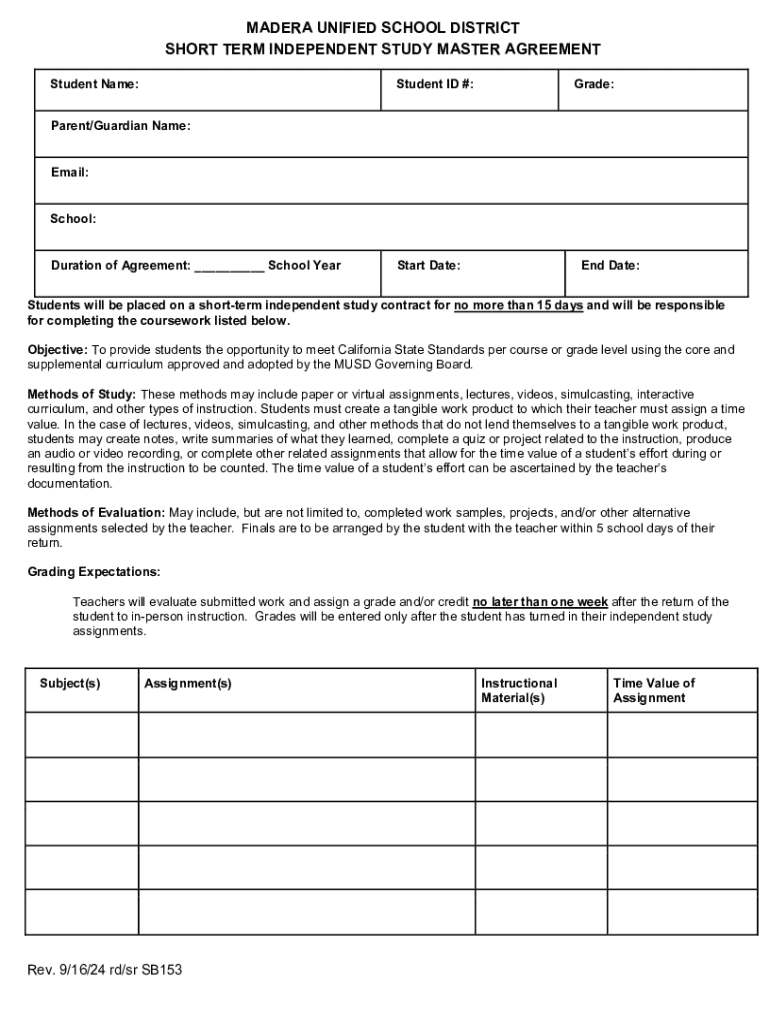 MADERA UNIFIED SCHOOL DISTRICT SHORT TERM INDEPENDENT STUDY MASTER AGREEMENT Student Name:Student ID #:Grade:Parent/Guardian Name: Email: School: Duration of Agreement: ___ School YearStart Date:End