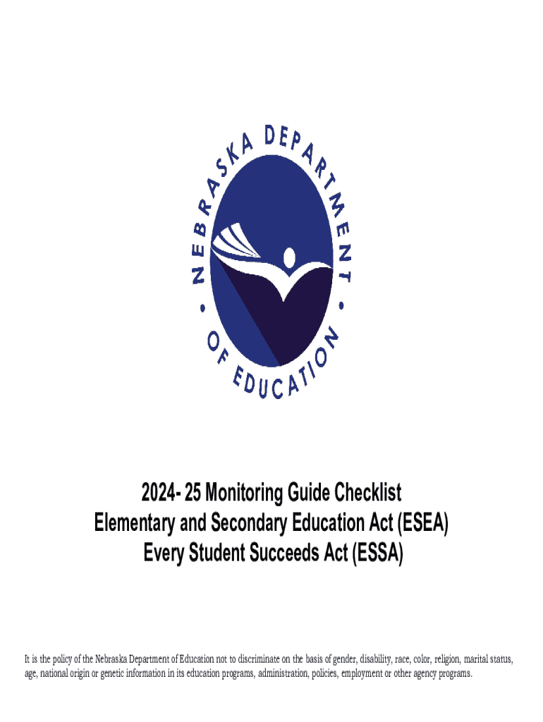2024 25 Monitoring Guide Checklist Elementary and Secondary Education Act (ESEA) Every Student Succeeds Act (ESSA)It is the policy of the Nebraska Department of Education not to discriminate on the