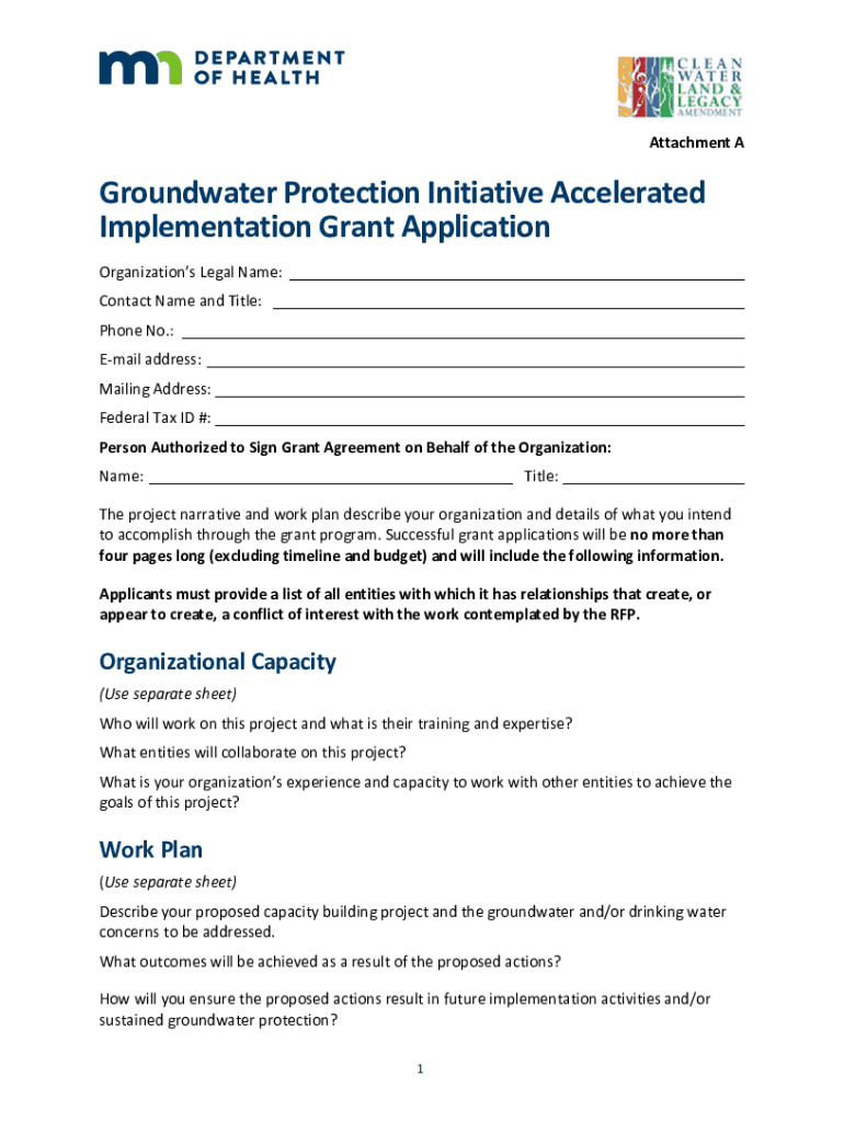 This document outlines the Accelerated Implementation Grant Request for Proposal (RFP) by the Minnesota Department of Health aimed at enhancing groundwater protection strategies across Minnesota. It provides information on funding opportunities, eligible applicants, project priorities, and application submission guidelines.
