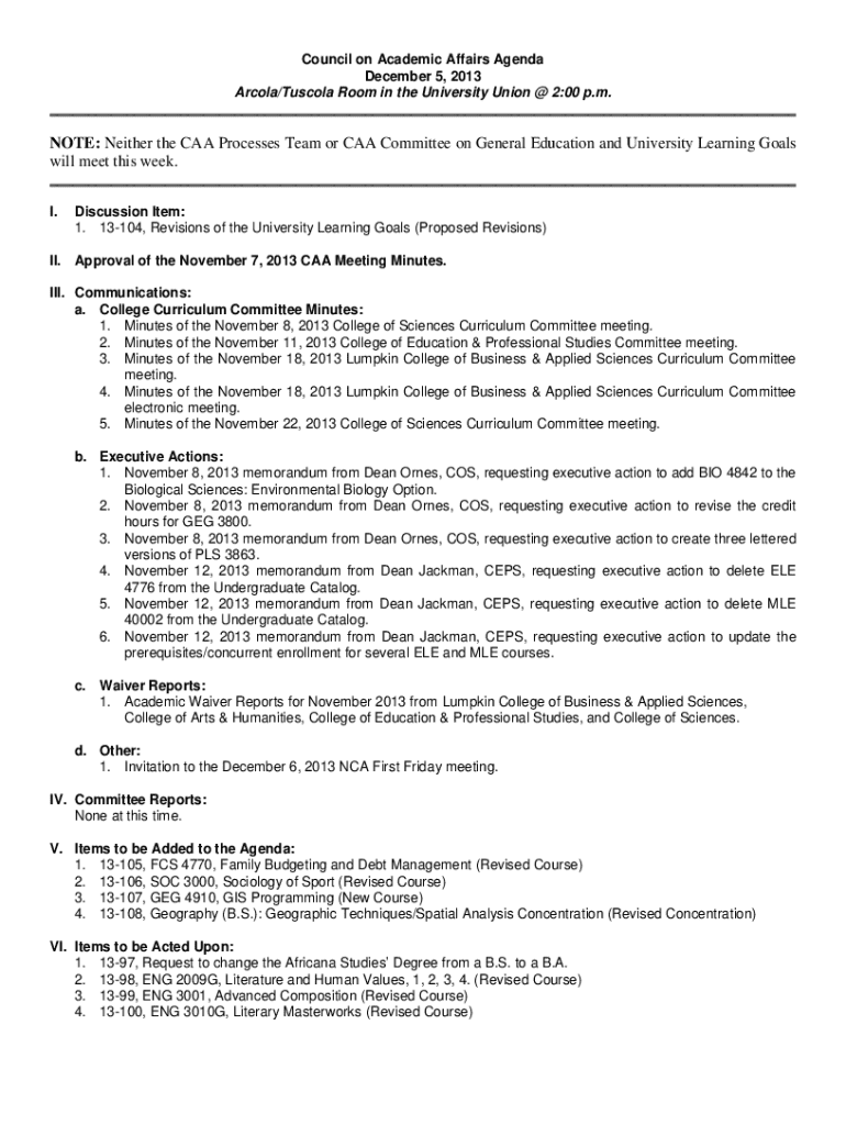 Council on Academic Affairs Agenda December 5, 2013 Arcola/Tuscola Room in the University Union @ 2:00 p.m. ___NOTE: Neither the CAA Processes Team or CAA Committee on General Education and University