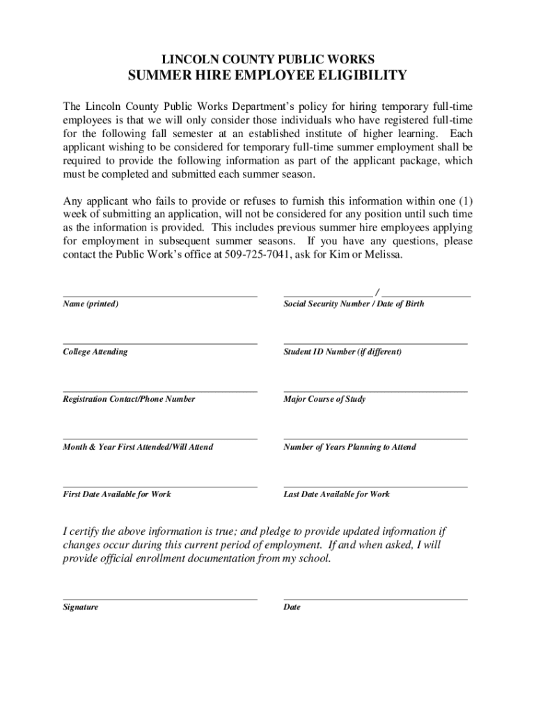 Get the free Summer Hire Employee EligibilityLincoln County Public Works