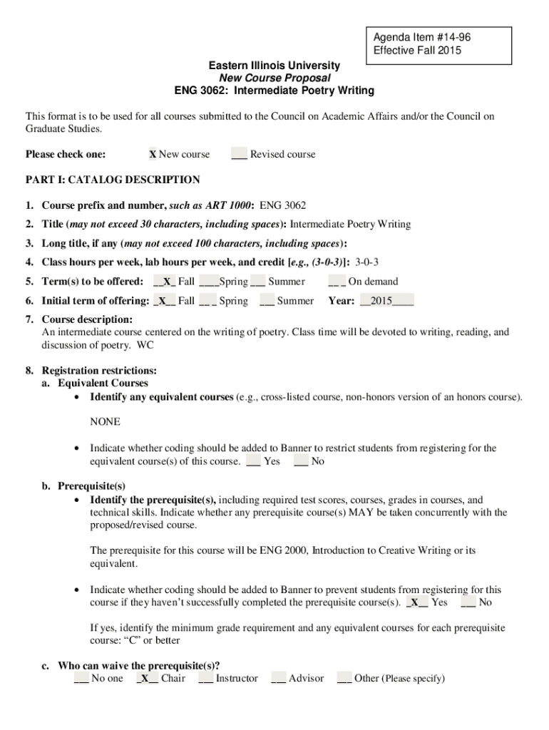 This document outlines a new course proposal for ENG 3062: Intermediate Poetry Writing at Eastern Illinois University. The course focuses on poetry writing and includes discussions, readings, and writing workshops to enhance students\' creative writing skills. It has a prerequisite of ENG 2000 and is designated as a writing-centered course.