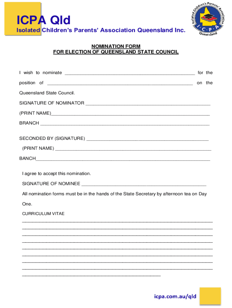ICPA Qld Isolated Childrens Parents Association Queensland Inc. NOMINATION FORM FOR ELECTION OF QUEENSLAND STATE COUNCILI wish to nominate ___ for the position of ___ on the Queensland State Council.