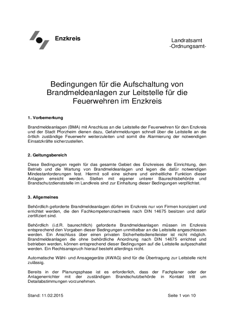 EnzkreisLandratsamt OrdnungsamtBedingungen fr die Aufschaltung von Brandmeldeanlagen zur Leitstelle fr die Feuerwehren im Enzkreis 1. Vorbemerkung Brandmeldeanlagen (BMA) mit Anschluss an die Leitstelle