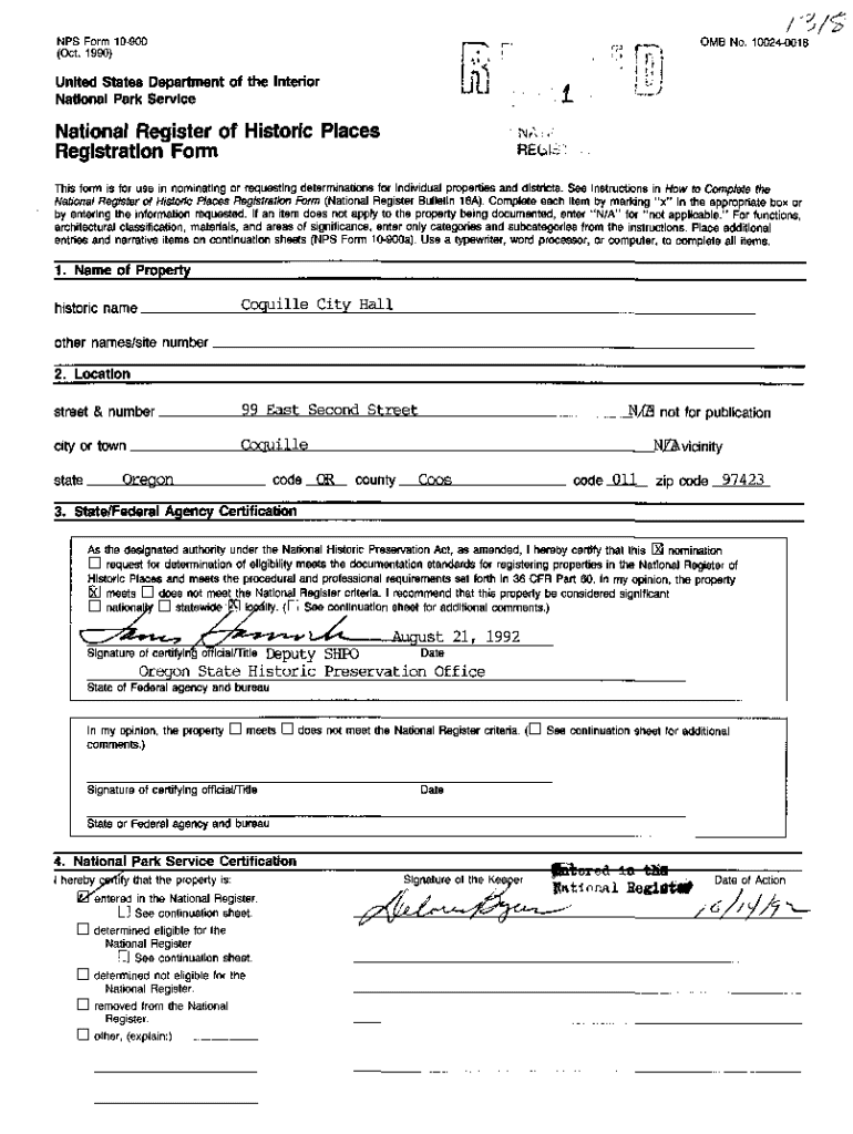 This document serves as a registration form for nominating or requesting determinations for individual properties and districts to be listed in the National Register of Historic Places, detailing the Coquille City Hall\'s architectural significance, historical context, and modifications over time.
