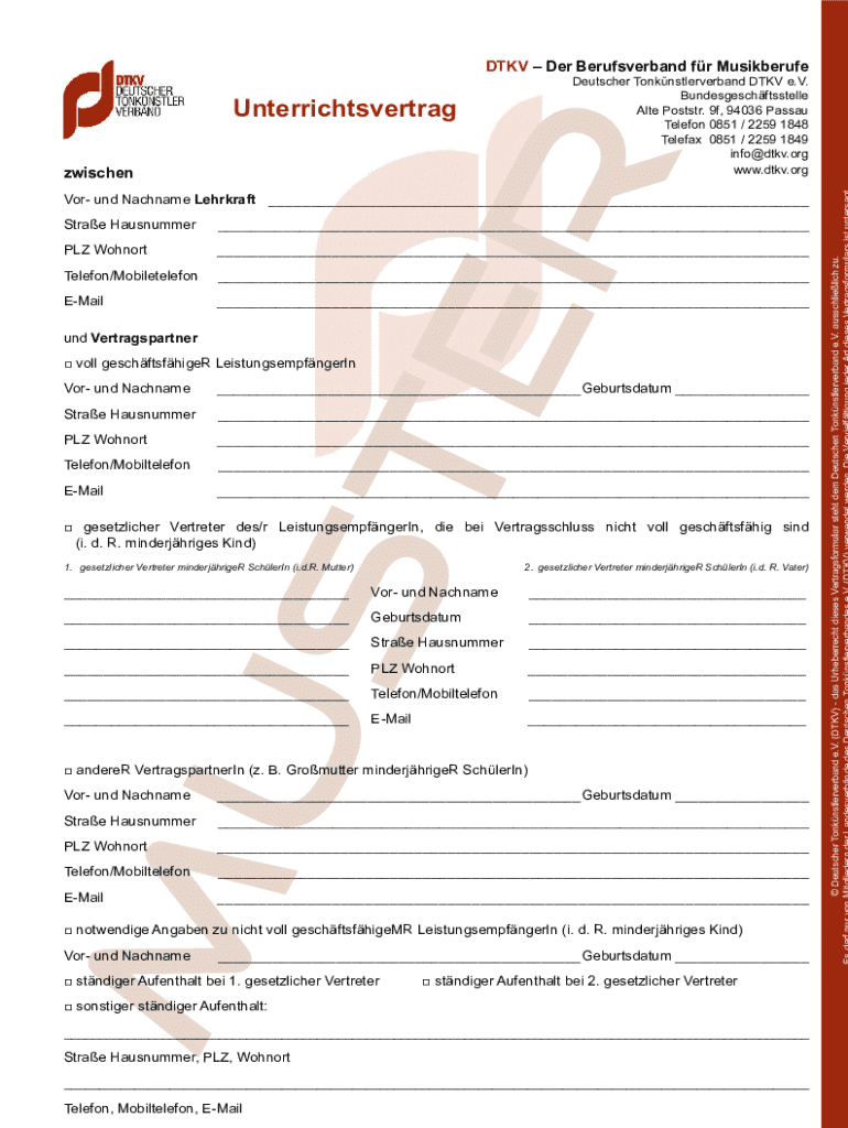 DTKV Der Berufsverband fr Musikberufe Deutscher Tonknstlerverband DTKV e.V. Bundesgeschftsstelle Alte Poststr. 9f, 94036 Passau Telefon 0851 / 2259 1848 Telefax 0851 / 2259 1849 info@dtkv.org www.dtkv.orgUnterrichtsvertrag