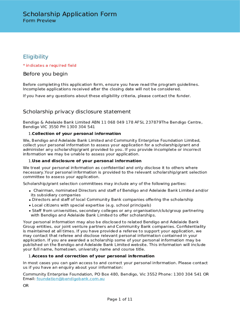 Scholarship Application Form Form PreviewEligibility * indicates a required eldBefore you begin Before completing this application form, ensure you have read the program guidelines. Incomplete applications