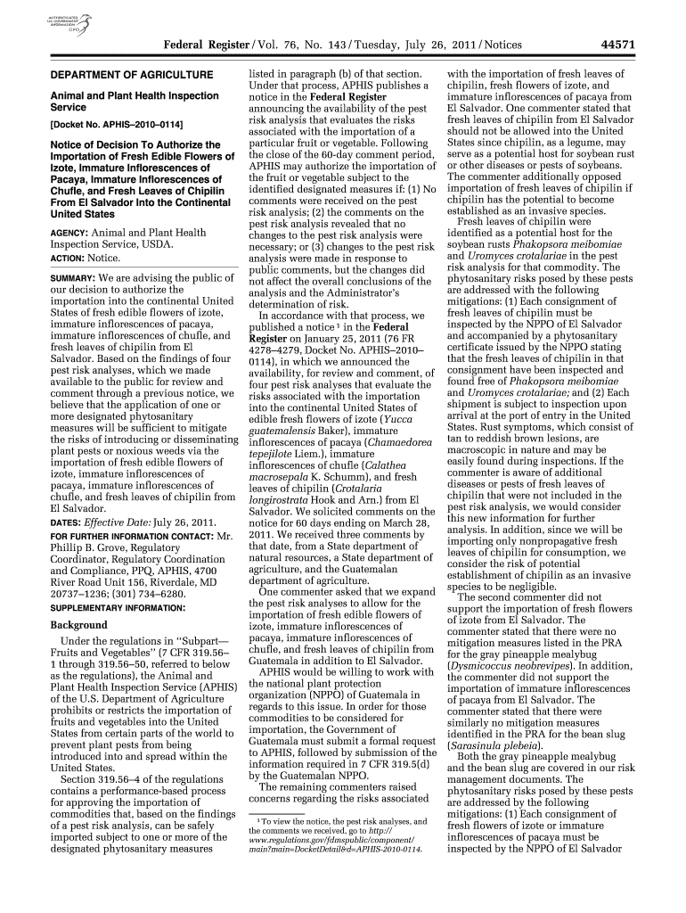 Federal Register / Vol. 76, No. 143 / Tuesday, July 26, 2011 / Notices DEPARTMENT OF AGRICULTURE Animal and Plant Health Inspection Service Docket No. APHIS20100114 Notice of Decision To Authorize